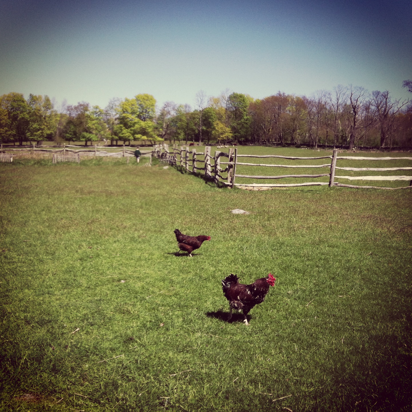 Chickens roaming free in the yard. They all looked so happy, going about their chicken business. One of the hens in the barn was very broody. She was sitting on her eggs yelling at us, we of course left her & her eggs alone.